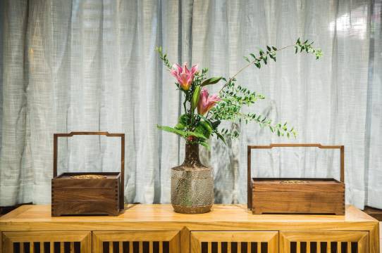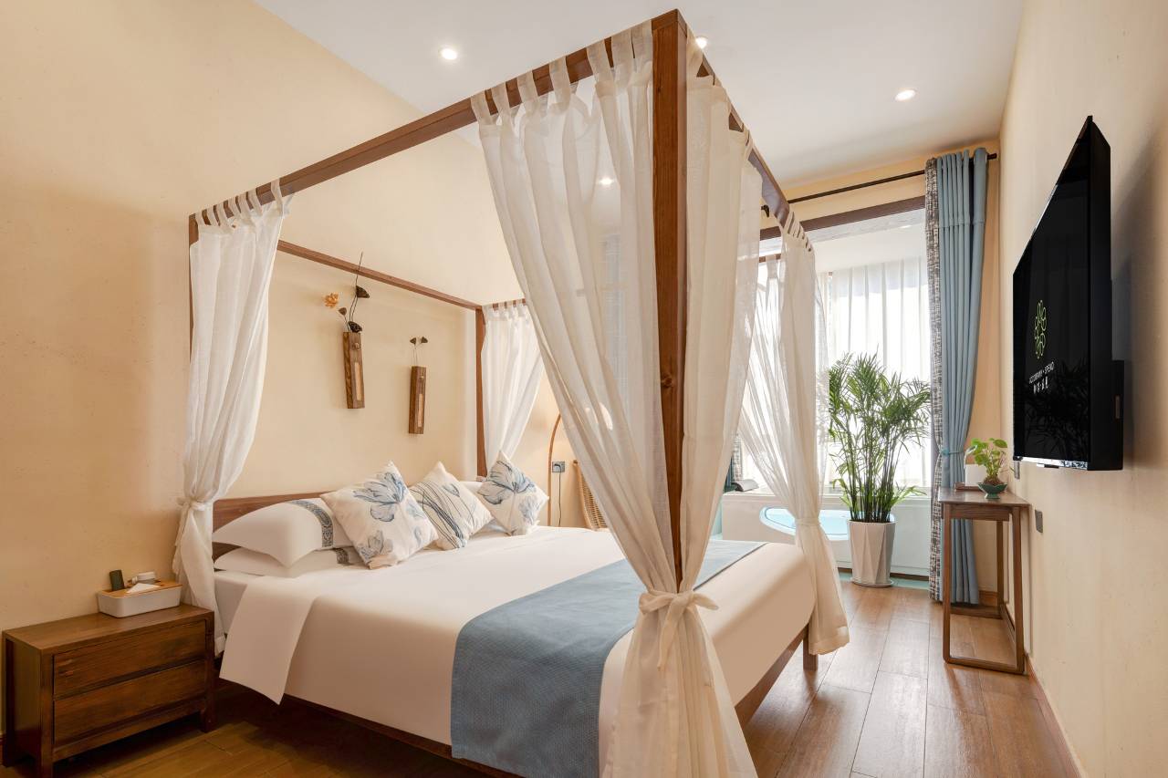 入室您会发现花宿每个房间不只是名字诗情画意,内饰也唯美简约,以自然原木的设计风格给人一种安静、禅意的感觉。靠窗的豪华按摩浴缸,在享受浪漫舒适的同时,亦可欣赏窗外竹从花草、明月松山,这大抵就是“今夜明月却如霜,竹影横窗更清绝”了。