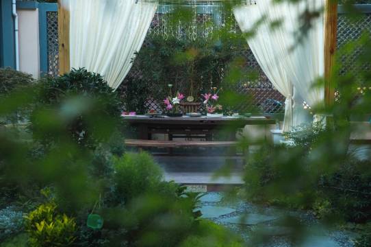 民宿位于西安市长安区抱龙村211号,距离西安市中心驾车大约70分钟,民宿为精致的关中小院,门口瓦片拼接的镂空墙、推门入四方小院,院子凉亭里用老旧门扇做的长桌,轻抚桌上抠门环,简朴而宁静,含蓄却丰盈。闲倚院内,清风、微光、树影、青竹、莲池、石板路,水声潺潺,聆听院里的声响,连呼吸都变得缓慢了。