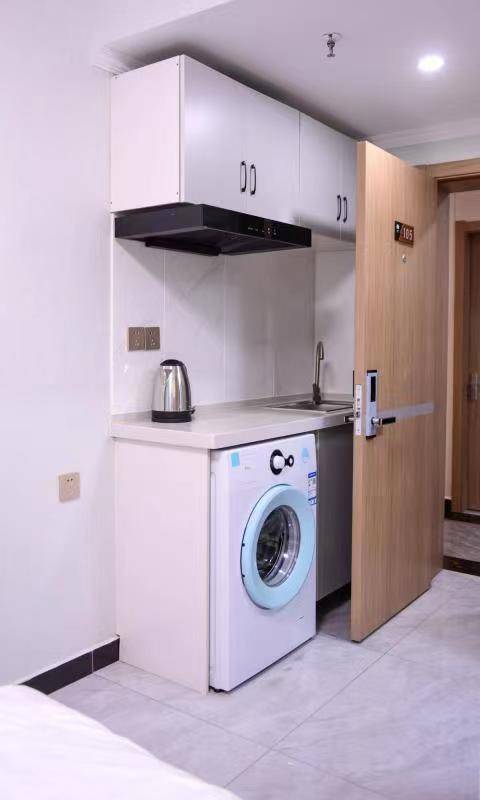 房间虽小但设备齐全,冰箱,洗衣机,小台灯,大衣柜,密码门锁一应俱全!