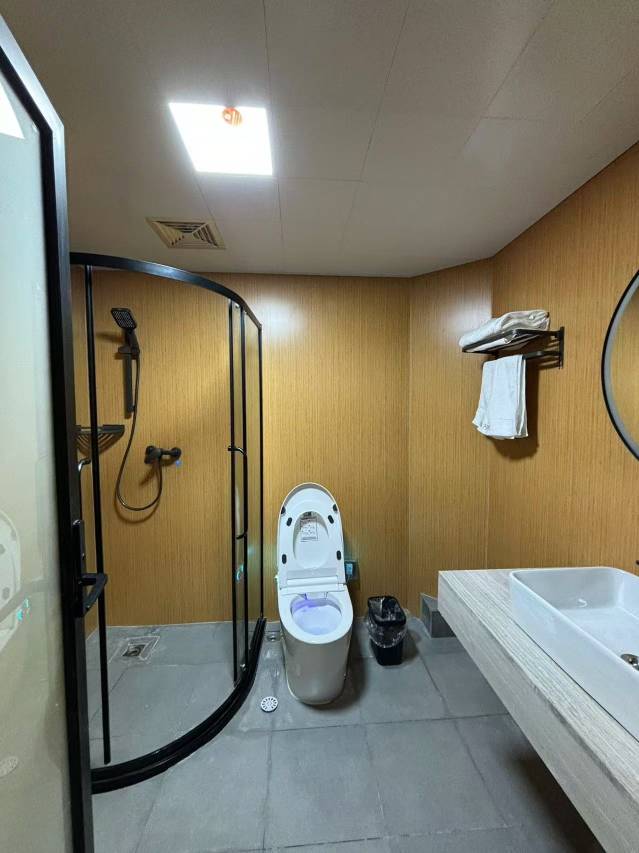 酒店装修没多久设施都很新,前台小哥很热情,卫生间有干湿分离!女朋友很喜欢!洗浴用品都是一次性的用的很放心,我特意看了一下玻璃都是双层隔音玻璃,放心睡!
