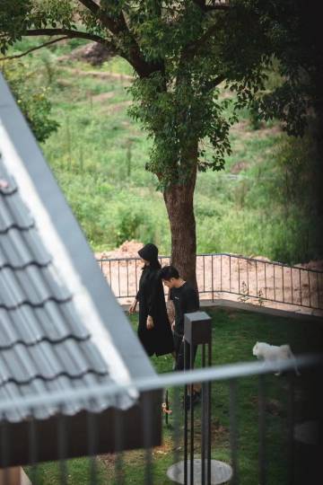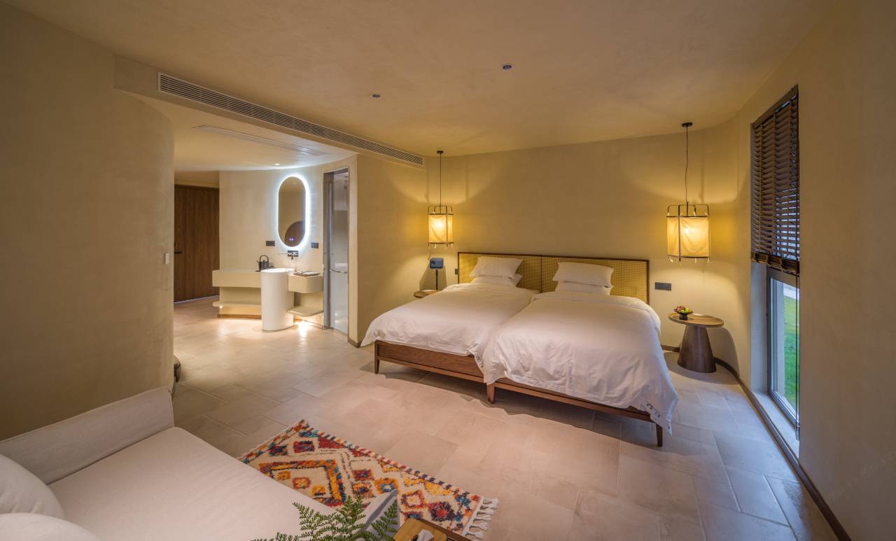 11栋小青瓦石墙,沿着竹径抵达。向外舒展的屋顶气势磅礴,恰到好处地与空旷山野为伴。居住者既可在泳池中畅游,感受阳光的温度、水流的动感、身体的跃动,也可躺卧在沙发上,望远方的景、听近处的心、思人生的过往,怡然自得。