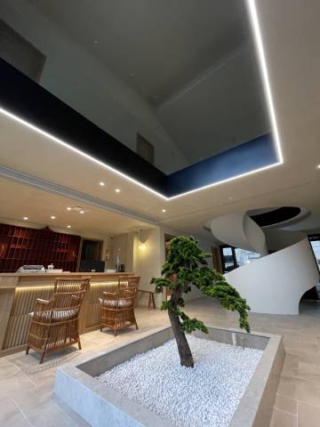 不增添多余修饰的屋顶与地面陈设形成对比,迸发出盎然生机,使沙发靠垫的柔软感、茶几的宁静感、边椅的慵懒感交融为一首诗,让铺洒进来的天光、精心搭配的画作、若隐若现的隔断,一同抒叙,闲适自在。