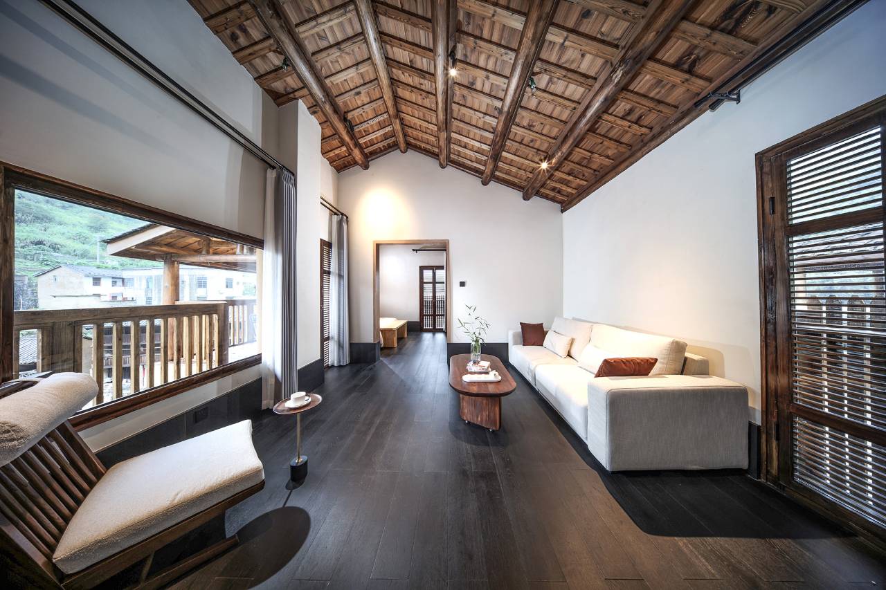 南靖塔下村·朴隐 深山处里的诗意休隐之所 · · 南靖土楼塔下村以长寿村著称太极水乡,是隐藏在南靖土楼田螺坑景区群山包围处里的百年古村落,沿太极“s”形状而建的土楼古居,几百年一代代传承的特色土楼群,天然成为城里人向往的远离尘嚣的休闲度假之地。 · 塔下村17号的朴隐民宿,循着古村落的脉络,带着新设计的思维,打造成日式山居风格的诗意休隐之所,简单、舒缓、平和,是我们想带给来此下榻的每一位住客。 空间设计|新旧共融 在保留土楼原有结构的基础上,将从土楼建筑特色里得到灵感融入到设计理念里,以简约的线条、结构和复刻土楼墙体色调和特征的设计手法,新旧共融,打造更舒适现代的居所。 在软装设计上,寻访当地的土楼,从中寻找有故事感的老物件,让这些写满时间和历史的老物件再次投入日常的装饰和使用,以此来呼应、唤醒、传递土楼百年生活的故事。 舒适客房|现代诗意 朴隐民宿仅打造5间智能精品的客房,现代化智能的舒适体验、推窗可见的土楼景观面、熨贴细软的日常细节;同时,我们将山居生活的诗意也表达在“郁离”、“绿筠”、“青岚”、“明玕”、“不秋”的美好命名里和一进门就会被轻易捕捉到的带有山野气息的花草里。 接待服务|细致周到 更饱满且周到的服务,以适度的方式触达每一位住客。休闲的欢迎下午茶、营养搭配的精致早餐、在咖啡厅里品一杯精品咖啡、在茶室里分享茶汤的滋味、在阅读室里安静的翻阅、品尝地道的客家米酒,希望每个来此的客人,都能找到一份自在的放松。 与其说朴隐是一个民宿,倒不如说它更像一个寻慢的所在,看光影在墙上移走、观群山云雾变色、赏一场忽来忽走的山雨、不经意抬头可见的星空、漫步在村道看土楼人家炊烟袅袅、闻一阵阵若隐若现的茶香、看晴天里家家户户晒物的景象,时间和生活在这里被逐渐拨慢,身心可以在这里稍微放慢一些也无妨。 ——