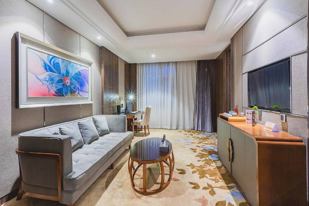酒店建筑面积2万多平方米,拥有两百余间新中式奢华客房,房间配有24h中央空调、茗茶及咖啡等设施,另推出零压力房、氧吧房及影院房型供您选择。