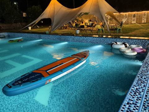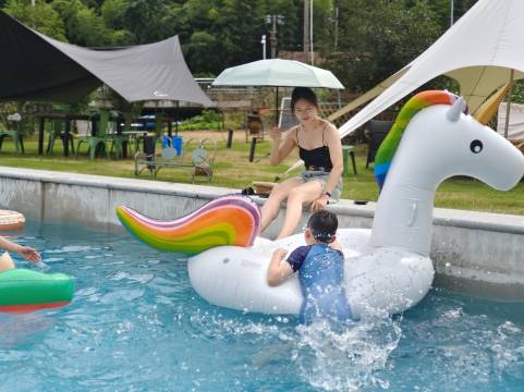 民宿还自带泳池,和天幕、投影幕布等户外设备,白天去景区玩累了,回来休息也很惬意。