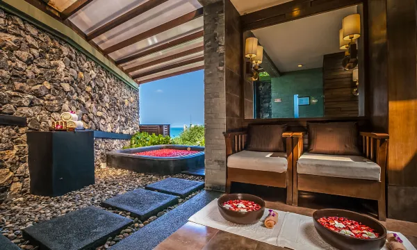 属于性价比极高的酒店,入住帮我们免费升级了最高的villa,完美的体验。酒店分两个区域,海边和山坡区域都有餐厅和无边泳池。