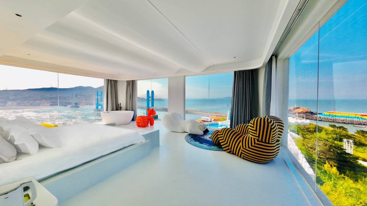 房间都是智能家居,投影仪很清晰,网速快,卫生也到位,270度的房间绝了,躺在床上就能欣赏海景,都不想出门了。吹着空调靠着海景太惬意了!