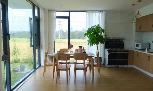 民宿位于村落的尽头,面朝一片旷野,主体是传统的川西民居,室内则是由知名设计师打造的轻侘寂风格,用胡桃木搭配不同层次的灰,以木器的温润与石材的粗粝呈现质朴的美感。同时配备了智能马桶、进口乳胶床垫及隔音窗,保证入住体验。